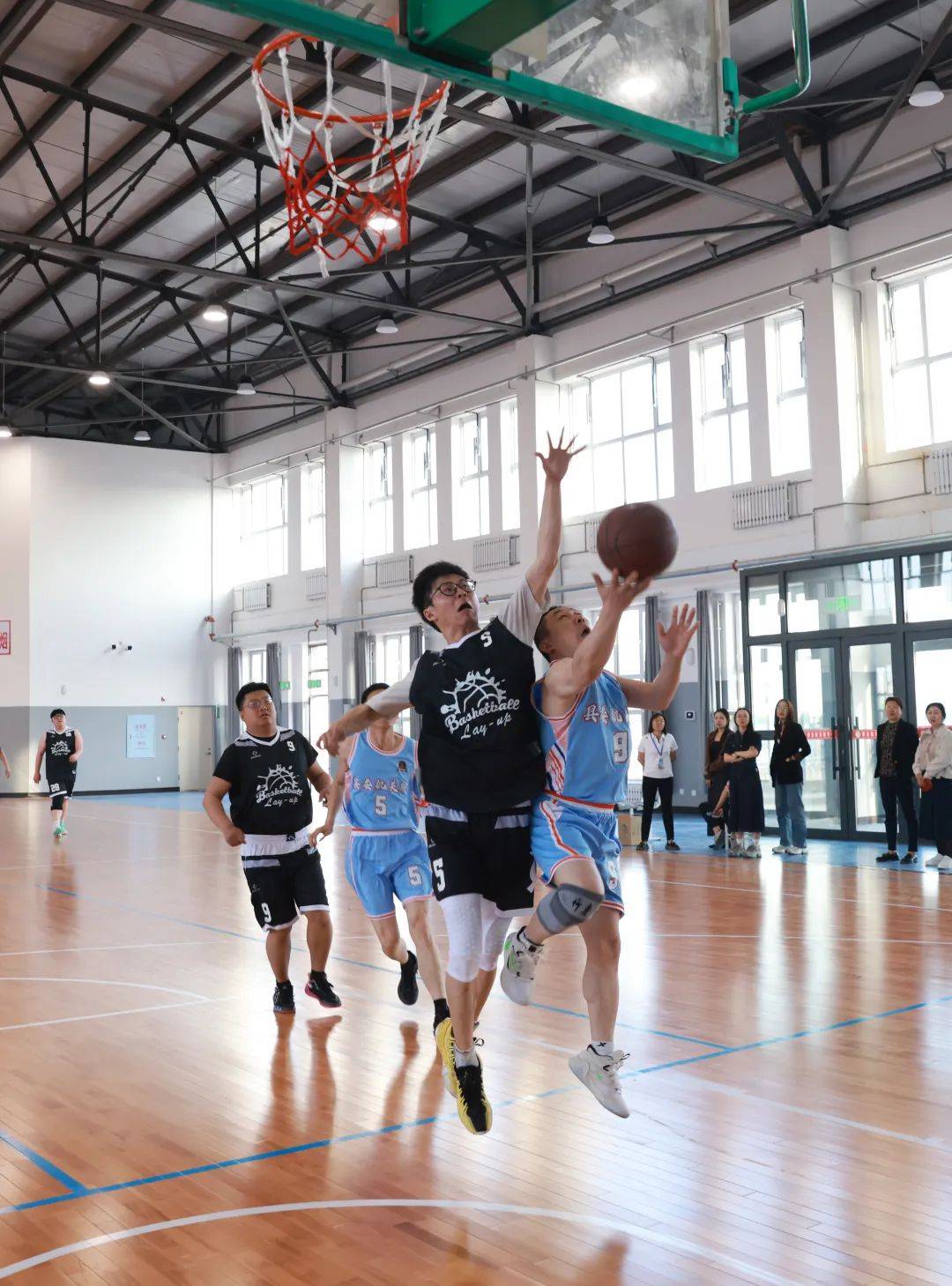 篮球比赛现场气氛热烈,队员们积极进攻,严密防守,精彩的配合以及巧妙地抢断都带动了场下的同学们的激情,他们虽然不能亲身参加比赛,但作为观众,也十分投入,为自己所在的系部呐喊助威,也为对方的球员的精彩表现拍手叫好,场上的队员以及场下的观众都被篮球的魅力所吸引,各队发扬“友谊第一,比赛第二”的精神,上下一心。